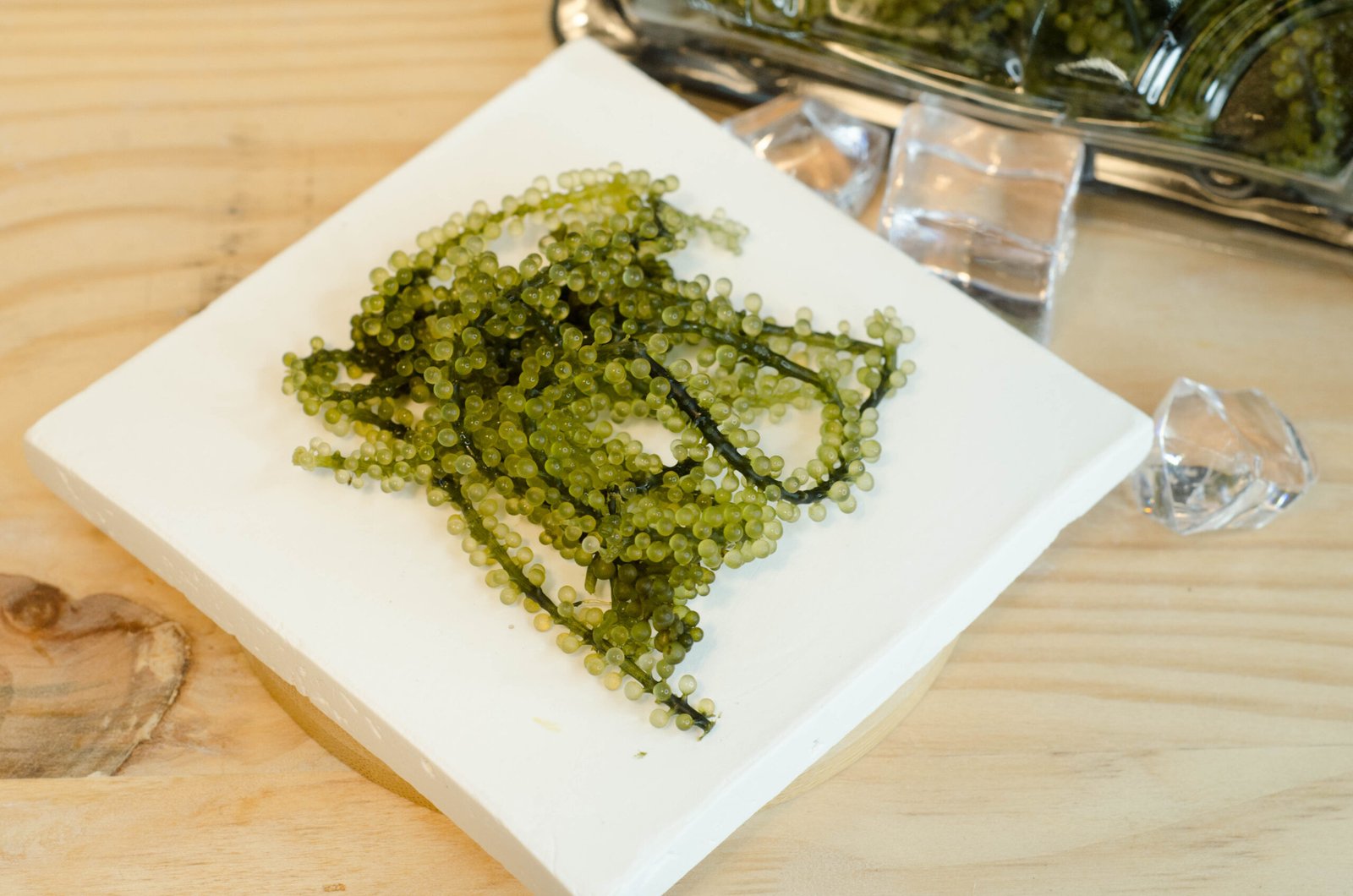 海葡萄(長莖葡萄蕨藻)因其飽滿的顆粒外觀和脆爽的口感,享有「綠色魚子醬」的美譽。它富含十六種優質胺基酸、不飽和脂肪酸(DHA/EPA)以及膠原蛋白,尤其因在沖繩長壽村的飲食文化中扮演重要角色,而被賦予「長壽藻」的健康意義。